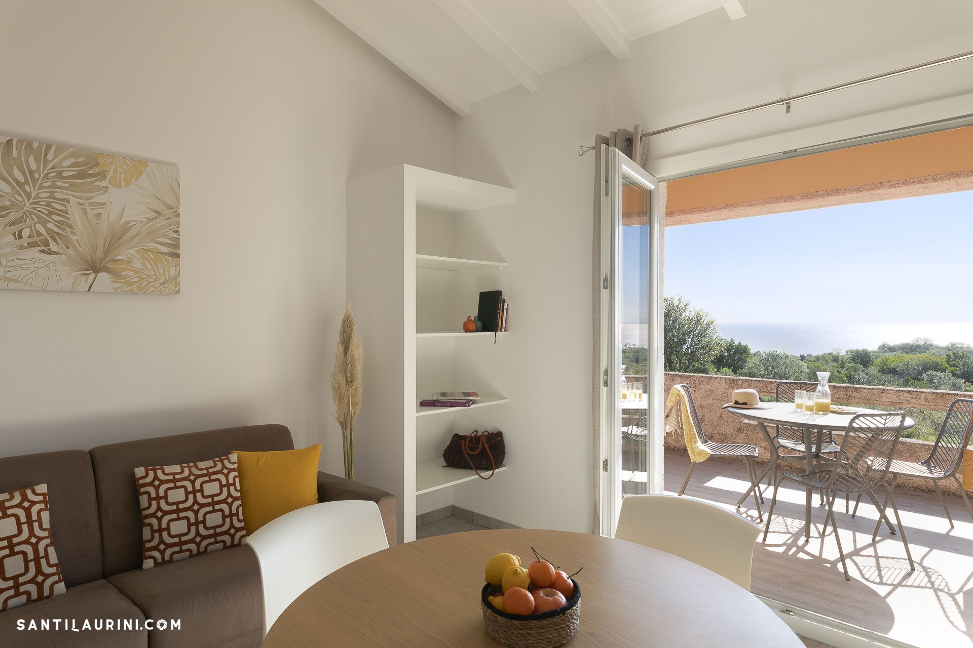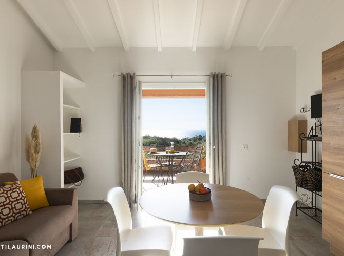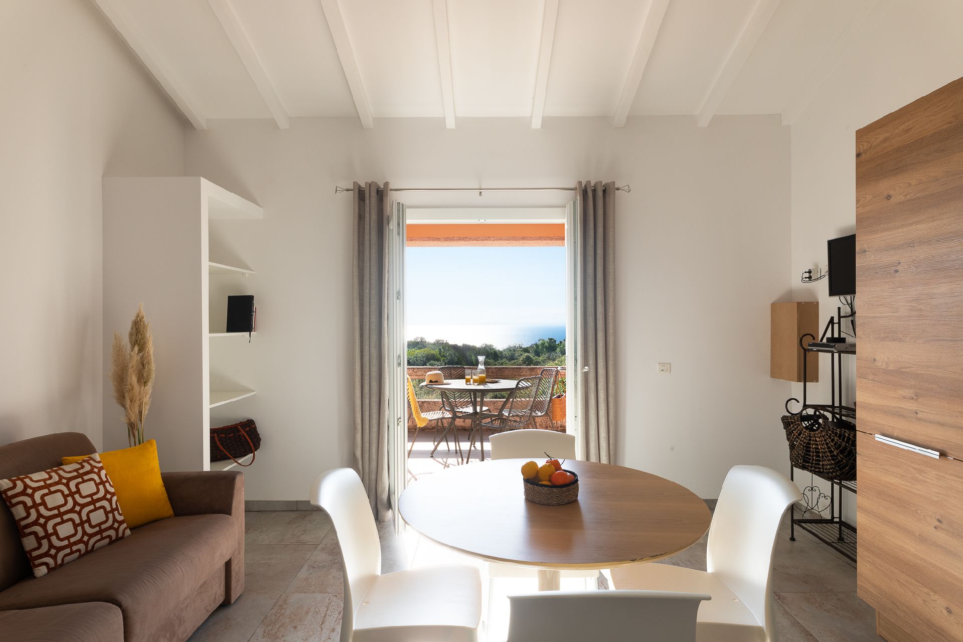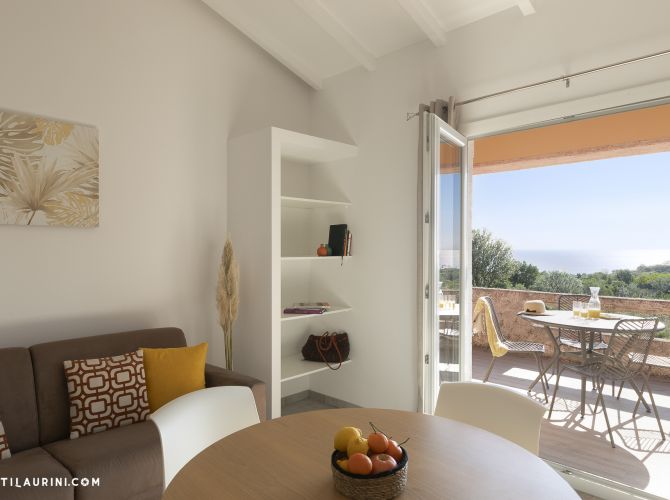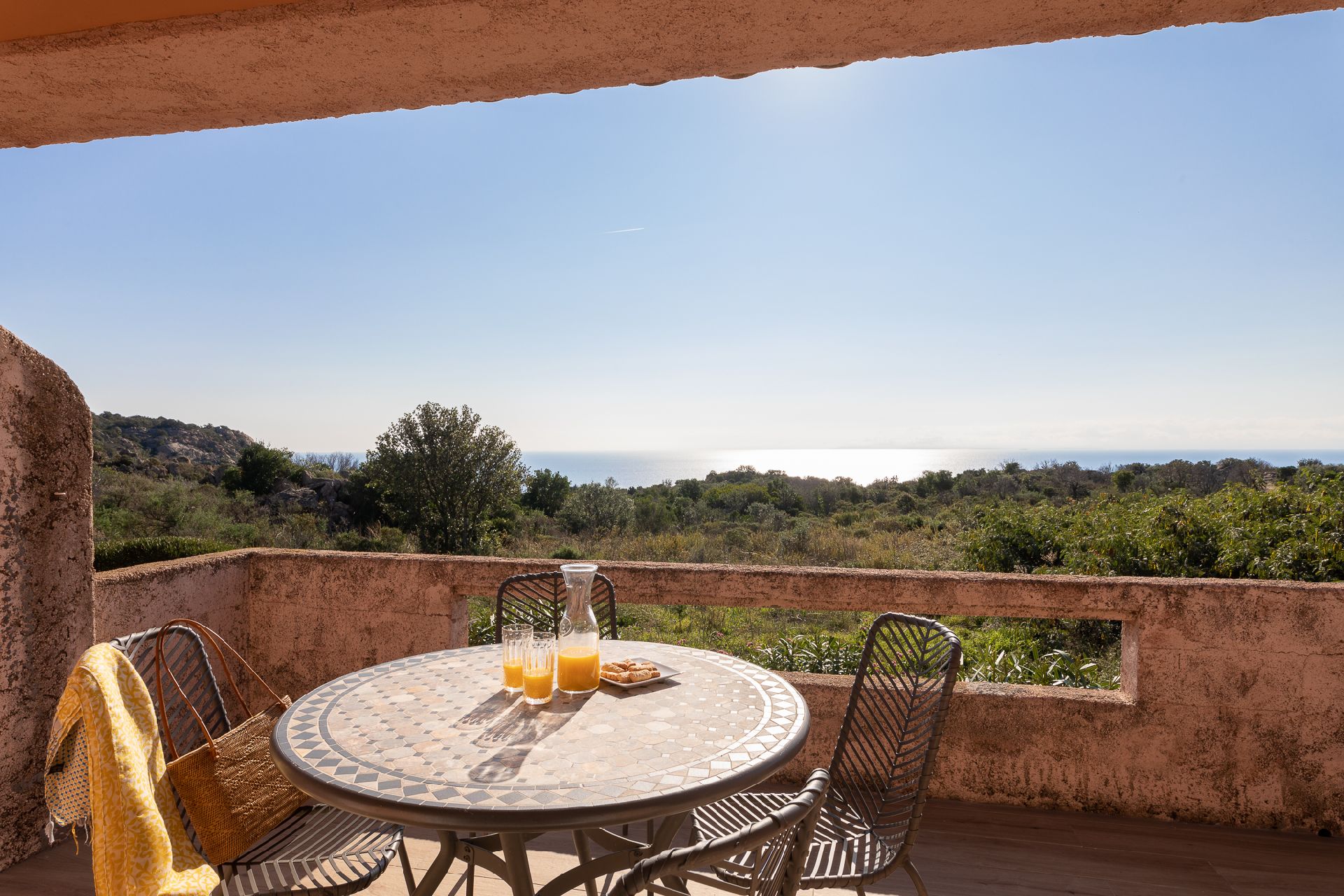 Terrasse avec salon de jardin, barbecue et vue mer.
