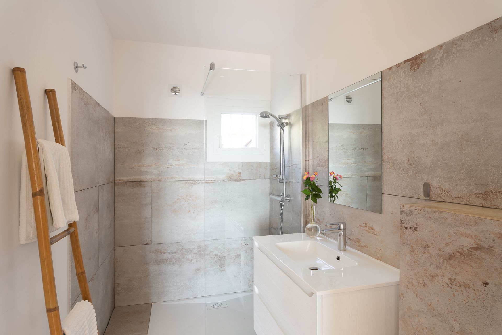 Salle d'eau avec douche, vasque, seche-cheveux, WC.