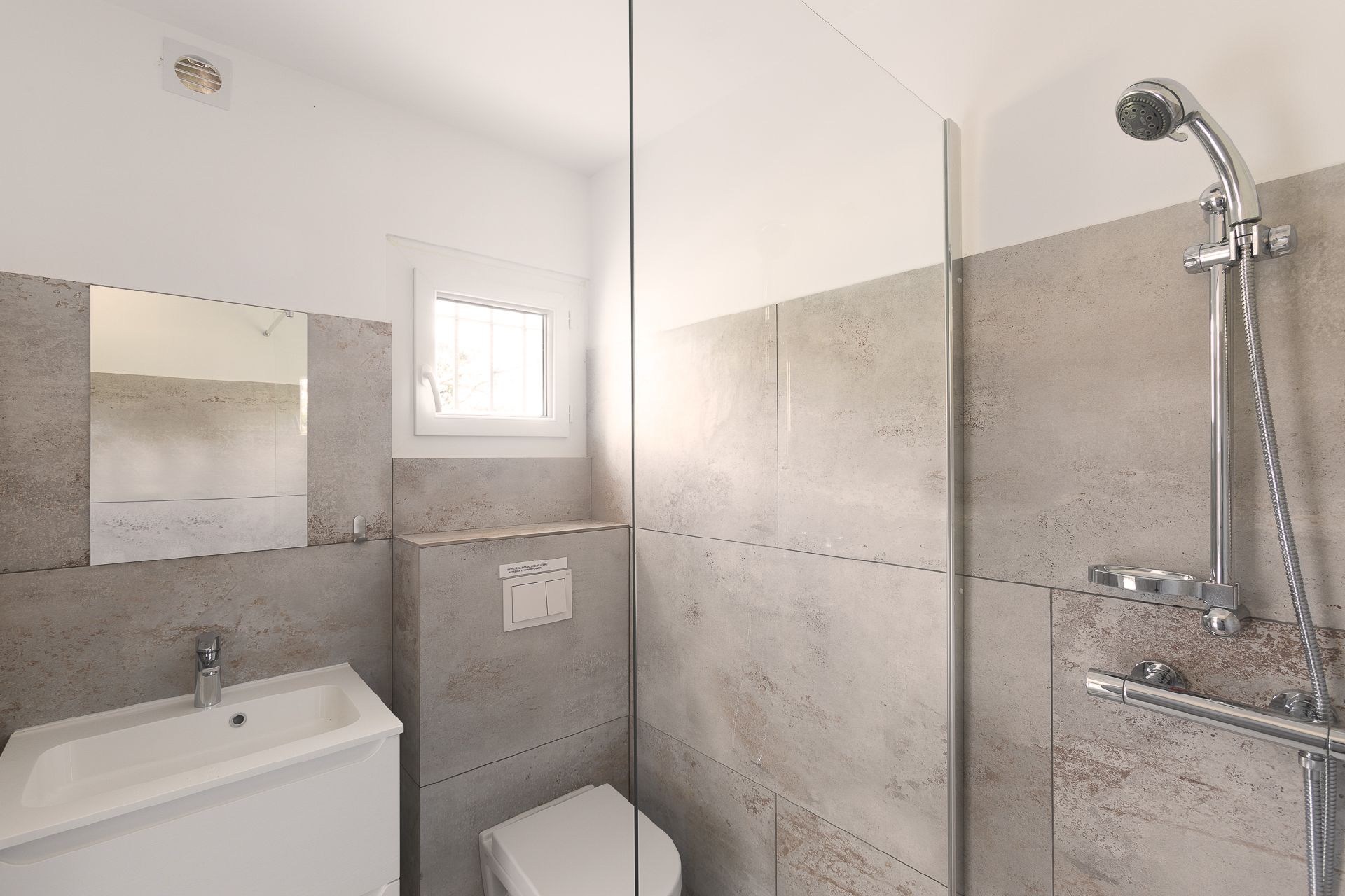 Salle d'eau avec douche, vasque, sèche-cheveux, WC.
