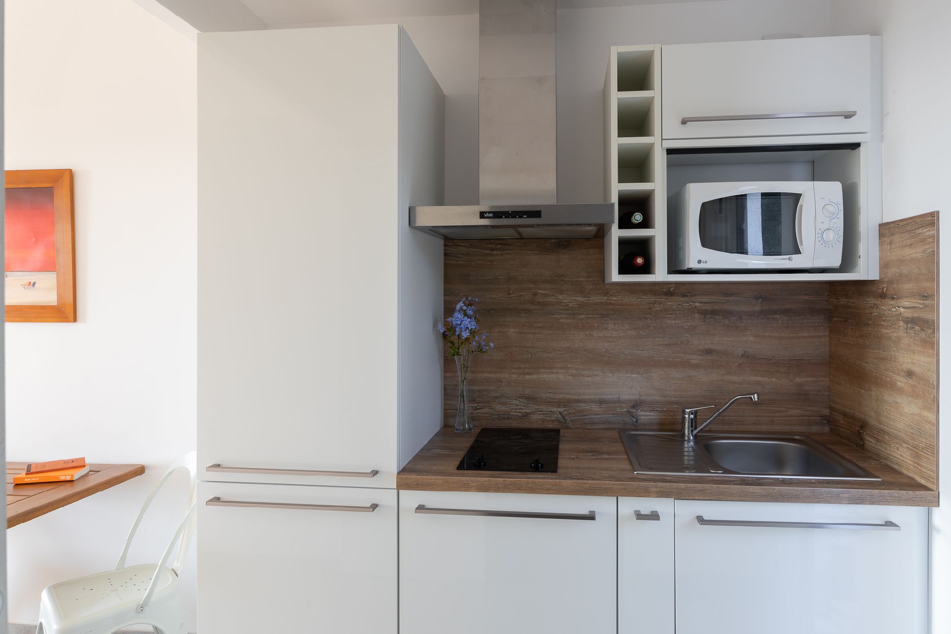 Cuisine equipée (plaque cuisson, four micro-ondes, frigo-congélateur, bouillore, grille-pain, cafetiere Nespresso).